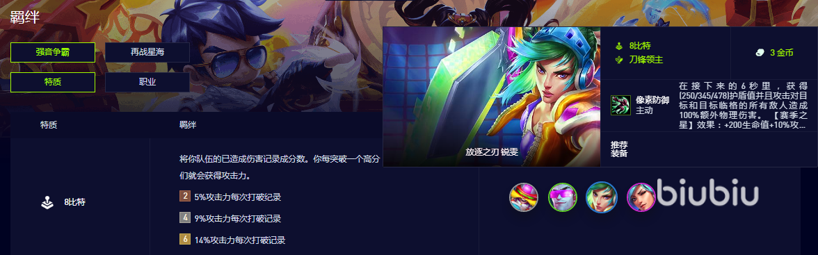 游戏中瑞文拥有8比特和刀锋领主两种羁绊,其主动技能像素防御,释放后会在接下来的6秒内获得对应的护盾值,并且对目标和目标领格的单位造成100%额外物理伤害。而刀锋领主的羁绊效果是让对应的刀锋棋子们,获得相应的攻速加成,当生命下降到50%以下时还会翻倍。攻击距离为1格的刀锋棋子攻击时还可以冲刺和斩击穿过目标。