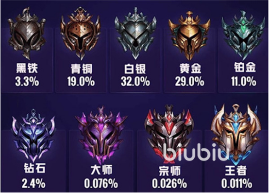 首先要介绍的是账号段位等级,也就是排位等级。这里一共可以分为9个阶段,从黑铁一直到最强王者,和峡谷是一样的,玩家根据自己的段位等级,就可以清楚的了解自身的实力。