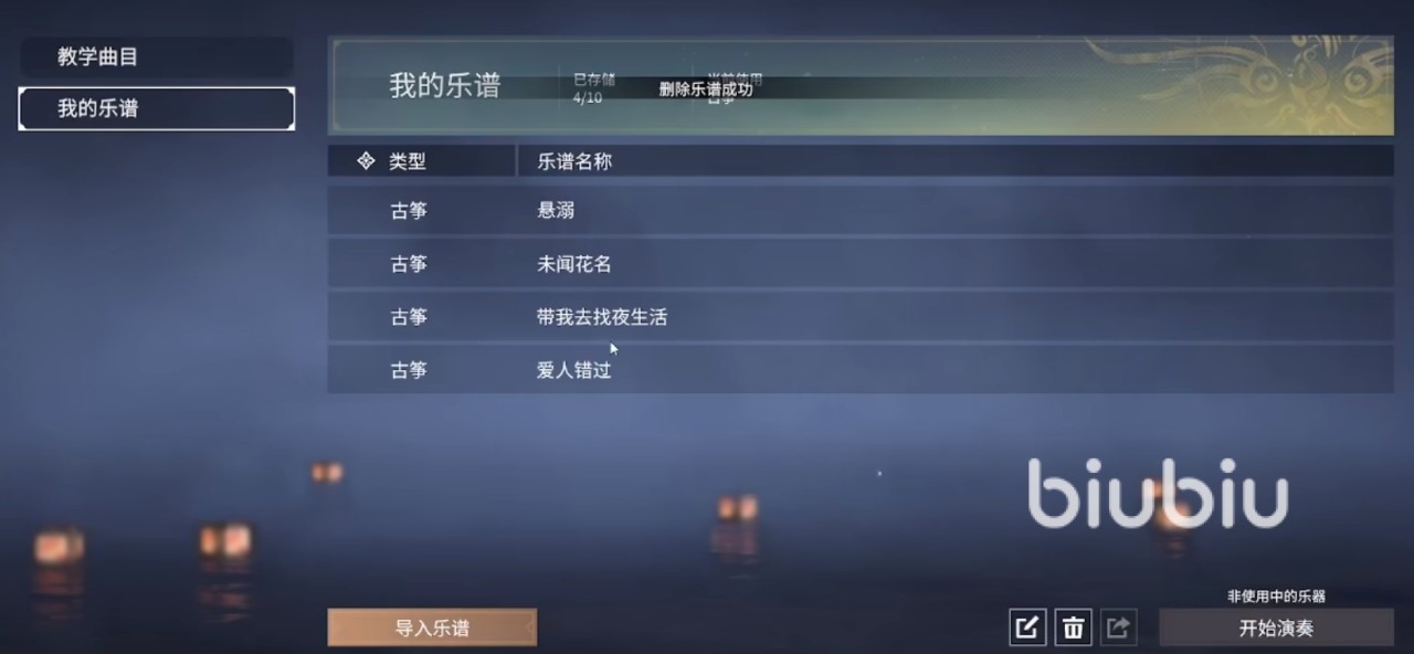 一个账号是可以存10个曲子的,在乐谱界面选择左下方的导入乐谱,然后输入广陵散就能够存储信息了。然后回到主界面,人物就会自动演奏,操作还是很简单的。