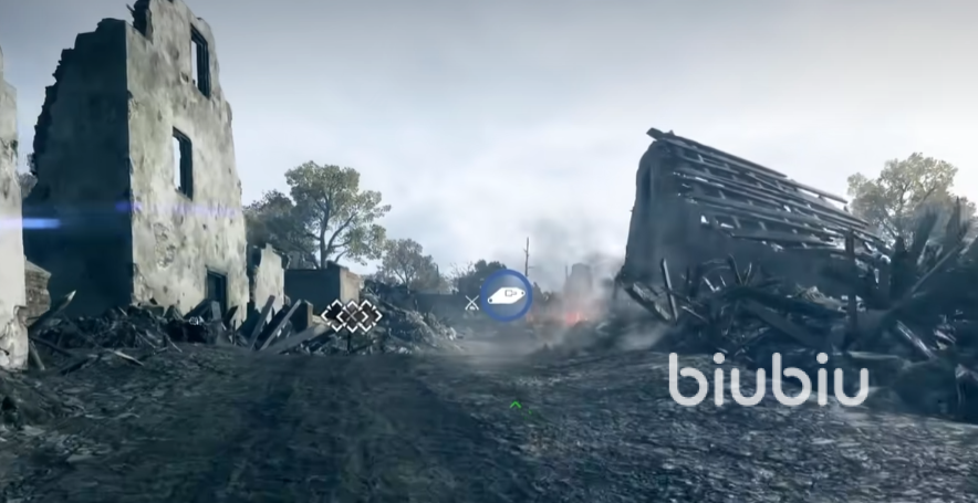 3、顺着城墙走可以看到被炸毁的房子,找到一个。