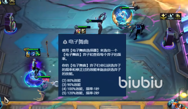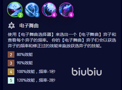 该羁绊属性是玩家们在使用这类英雄的时候,可以使用【电子舞曲选择器】,然后挑选一个该类别下的弈子,并且可以查看每个弈子的频率。而在使用这些英雄时,被选中的弈子频率以及修正过的效能会影响弈子们释放技能的效果。该效果分成4个档位,2个是80%效能,3个时是90%效能,而4个是100%效能且频率-1秒,5个变成了120%效能,频率-2秒。