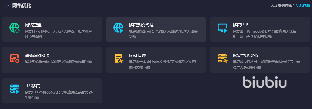 Steam平台自身服务器的优化是没有问题的,是因为国外的网络和国内的网络在互联时会产生冲突,这也就是各个游戏卡顿、进不去的源头,biubiu能很好地化解这些问题,从根本上去解决卡顿,同时还可为你解决Host清理、系统代理错误等等问题,想要找到这些内部文件修复功能的话,可以将目光锁定在右上角的“工具箱”标识,点击进入就能找到你想解决的问题修复按键。