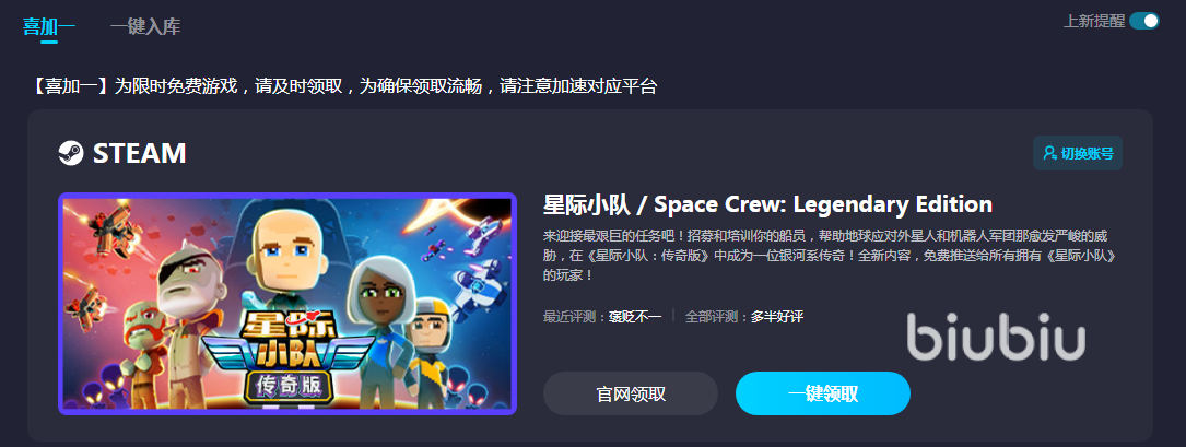 小编推荐大家是用biubiu还有一个重要原因是它不定期就给大家送福利,关注游戏领取并打开上新提醒,每次喜加一更新新的游戏就能领取了。这些游戏都是biubiu精挑细选出来的,免费赠送给大家,大家根据操作的指示领取就可以了,领得越多省得越多,以后玩steam游戏都不要自己花钱买了。