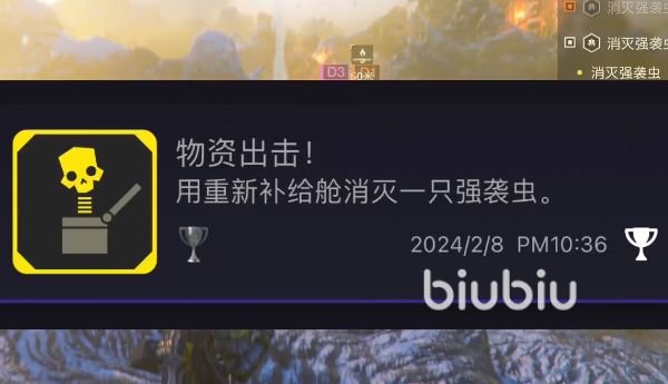 【物资出击】需要我们用重新补给舱消灭一只强袭虫,而【重新补给舱】就是补充弹药的那个空投。特别需要我们留意的是黄色空投,那个是所有小队成员共同享有冷却时间的。我们在使用这个物品对付强袭虫这种怪物时,可以将它粘在虫子身上,等它自动完成爆炸时便可获得成就。
