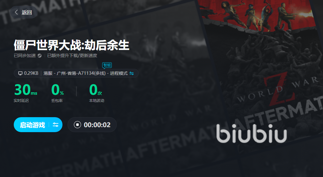 进入加速状态,帧率就会被提高,延时也被降低,玩家的操作就变得流畅了。其次就是网络稳定能力biubiu的也很高,丢包率会控制在0,波动也不出现了,这样就能稳定在线。这种网络状态,就是玩家们的底气,看到再多的僵尸,手不抖,心不慌,轻松打完。