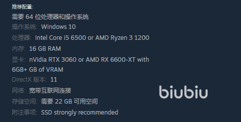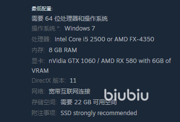 我们系统首先最起码是64位的win7,处理器得达到FX-4350,显卡是6GB的RX580就能满足游玩需求,内存条上单根8GB即可,最好是有22GB的SSD硬盘空间,这样读取更快,以上条件均能满足的话,那我们就可以用最低特效去玩这款游戏,它在电脑硬件圈内属于低配置了,大部分人的电脑应该都能玩。