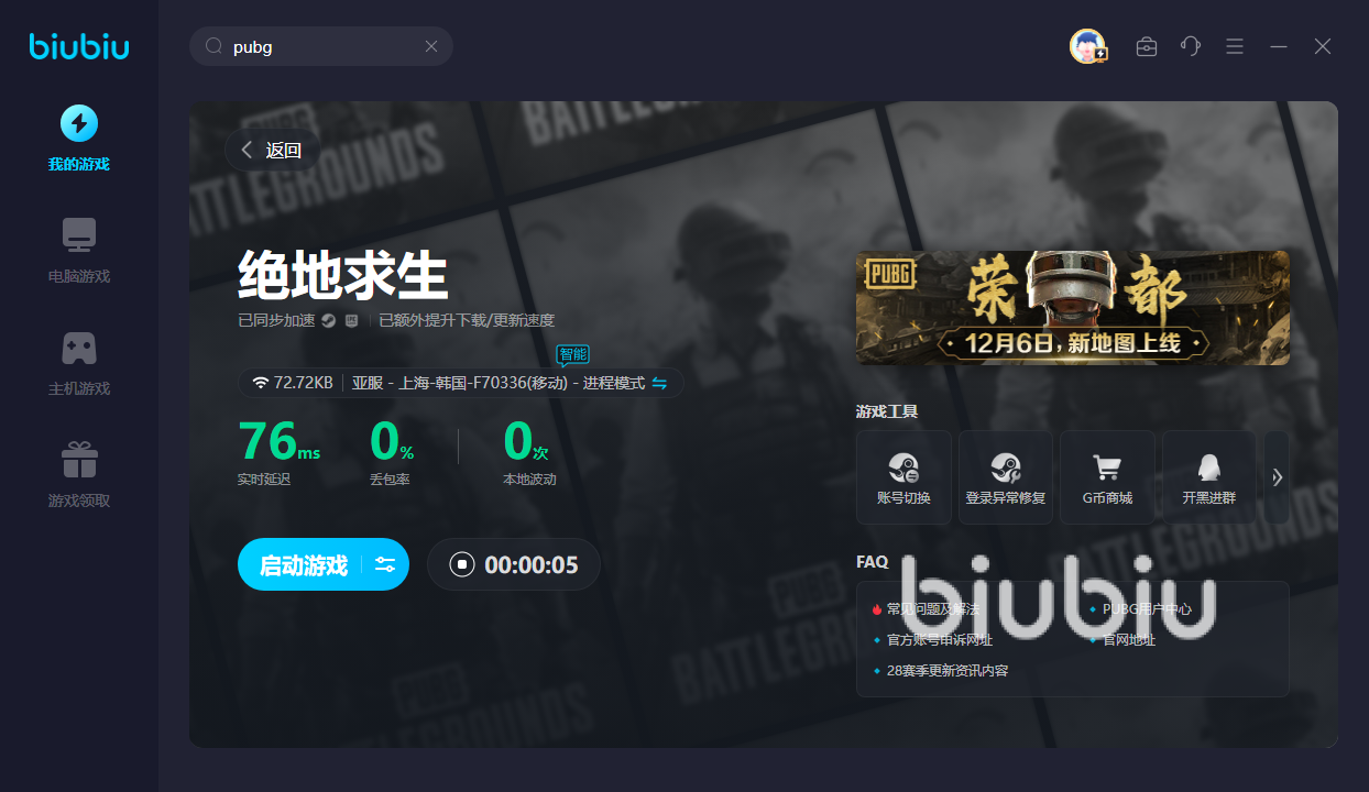 2024年03月08日 14:22 来源:复仇下双弹瓦斯Pubg也叫做绝地逃生,是知名的吃鸡类游戏,但有时玩着会卡。那么pubg卡在进入画面怎么解决?之所以会卡在进入的画面中,主要因为网络不好,这时可运行biubiu。就能获得极速网络,从而解决卡顿的情况。让你顺利地加载出每一帧画面,从而不会卡住。方能在后续地对战中继续斩获胜利,而不是玩到一半就没了。