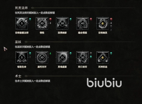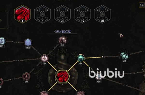技能面板可以看到对应的职业分支下所有的专精技能,当我们角色到达四级后,系统便会解锁第一个空位,选择好对应的技能后再次点击图标,便可进行到分配节点的界面。如果界面上显示的是灰色并且在中间有显示数字的话,这就代表着当达到一定等级后便可解锁这些技能。