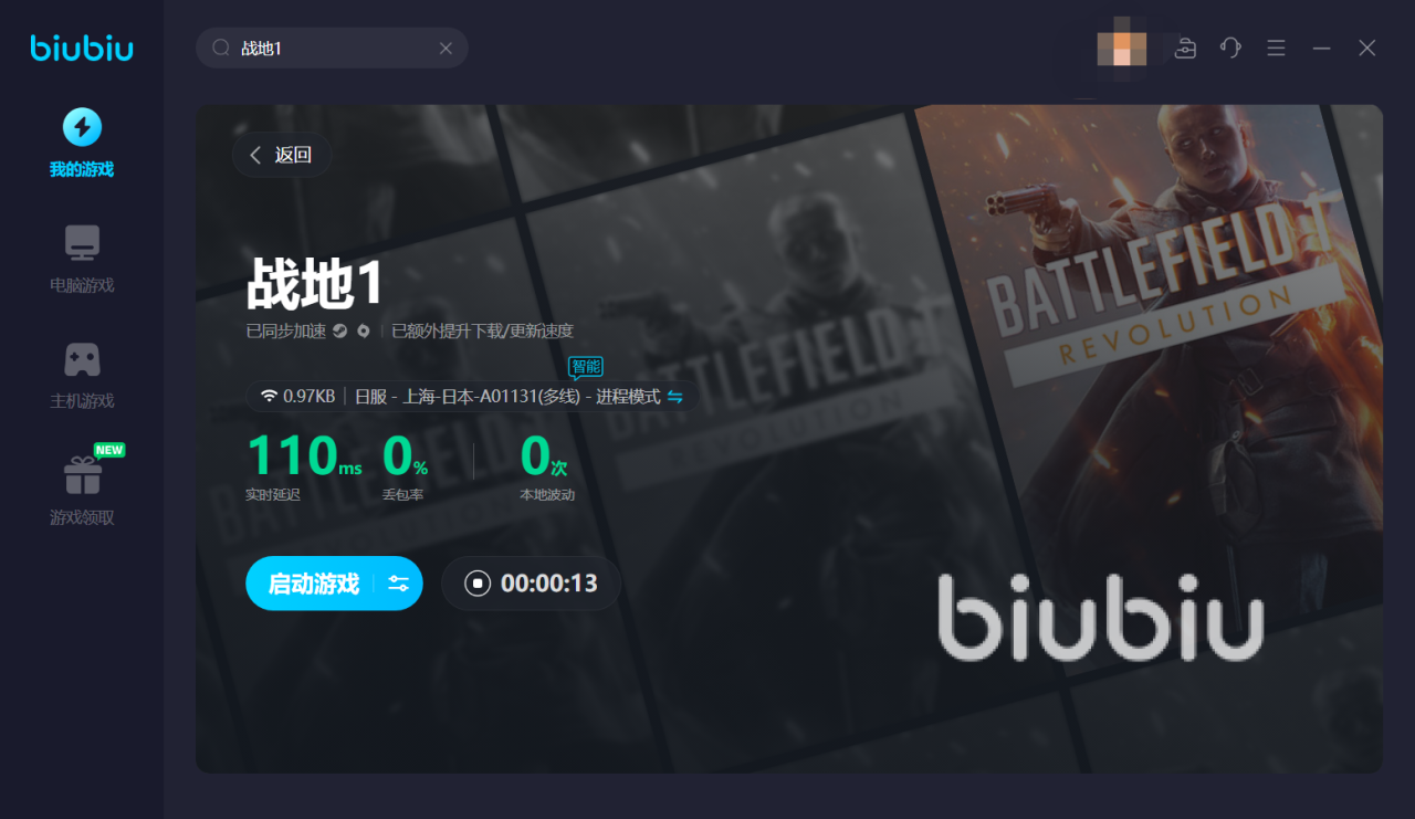 biubiu加速器能够支持加速的游戏类型和数量都超级多,为这些热门火爆的游戏都提供了专属的加速服务,大家可以通过页面上方的搜索框搜索搜战地1,找到之后点击一键加速就可以开启加速了,随时开启游戏加速之旅,随时也能暂停,充分的感受这个游戏为你带来的魅力和战斗的快感,游戏结束时点击停止加速就可以了。最新推出的游戏,加速器平台也会在较快的时间内提供加速服务的。