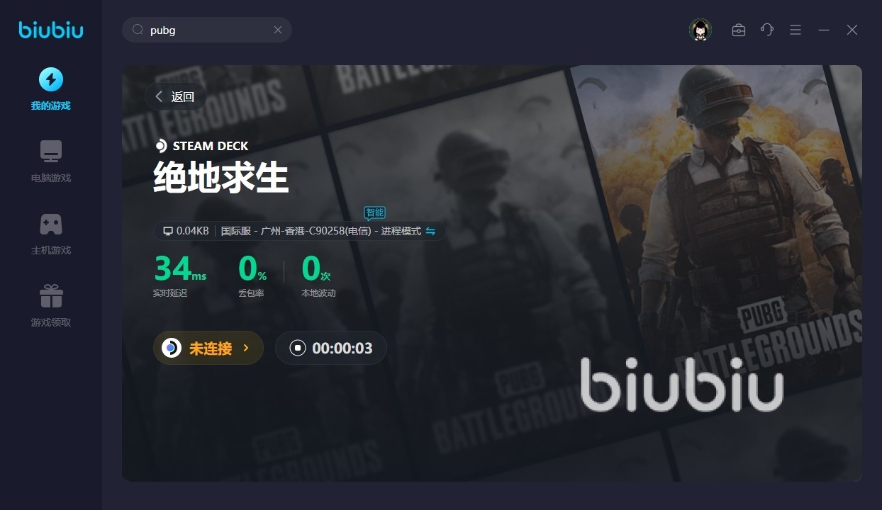 2024年03月11日 17:22 来源:消魔又大舌贝很多玩家对于这款游戏还是非常喜欢的,因为它能给大家带来刺激的枪战体验,同时射击的感受上也很是逼真,下面小编就来和大家说下pubg老是闪退怎么办,在游戏的体验过程中,如果玩家自身经常会遇到卡顿或者延迟非常高的话肯定是不行的,所以就需要通过biubiu来运行,它作为专线级的加速功能,能够为大家很好的稳定游戏网络环境。