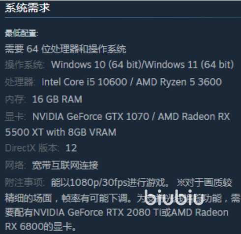 如果想要以最低特效30帧数运行此游戏的话,电脑最起码得达到i5-10600CPU加1070显卡的配置,这是最主要的要求,其它的像运行内存可以使用单根16GB或者8+8的形式,但是有些场景战斗的画面比较多,有时候怪物数量也多,我们有可能得上20系支持光追的显卡。