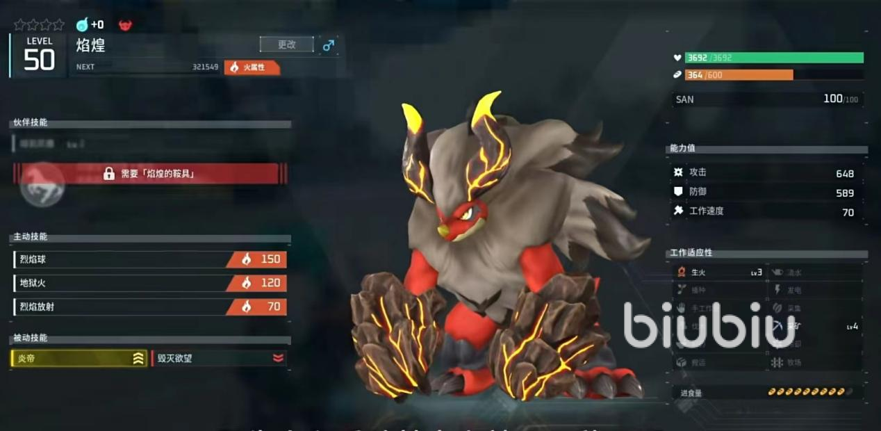 焰煌的技能非常强劲,它的主要技能是使用烈焰球,在头顶上方生成一个巨大的火球并朝向玩家发射。火球如果命中会造成爆炸并附带大量的伤害,其范围非常大。另外地狱火和烈焰放射的威力也不容小嘘,地狱火可以使地面崩裂爆炸,对敌人造成巨大范围伤害。而烈焰放射是朝向敌人释放火焰,造成持续伤害。焰煌拥有3级生火和4级采矿,有了它玩家的生活和采矿就有了保障,特别是4级采矿是最高等级,综合来看焰煌还是一个非常不错的生产力。