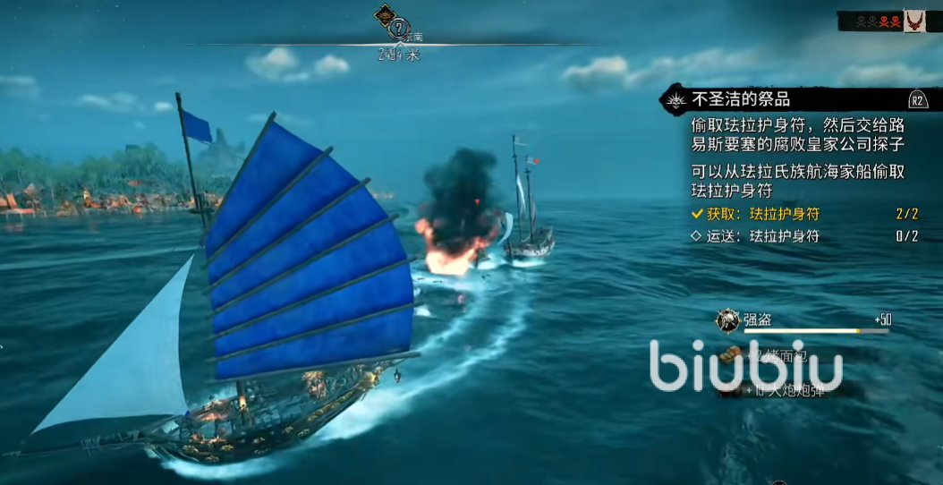 清完怪来到光束指示点,就可以偷取护身符了,回去交给等在岸边的强盗,任务完成拿到奖励。后面的大部分环节都是各种委托小任务,让玩家熟悉海上对战操作,开展各种小任务,直到积累了足够物资,玩家将自己的小船升级到中等就进入下一个篇章了。