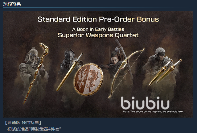 这里小编就以PC端的版本为例给大家简单介绍下。首先steam的商店里面目前有两个版本可以进行购买,而预购了标准版的朋友可以在游戏上线以后获得特制武器的四件套,它们分别是龙头状的拐杖、黄金色的剑加红白双盾、金色的弓箭以及黄金双手剑,相信在实战中这些能给大家带来不同的战斗体验。