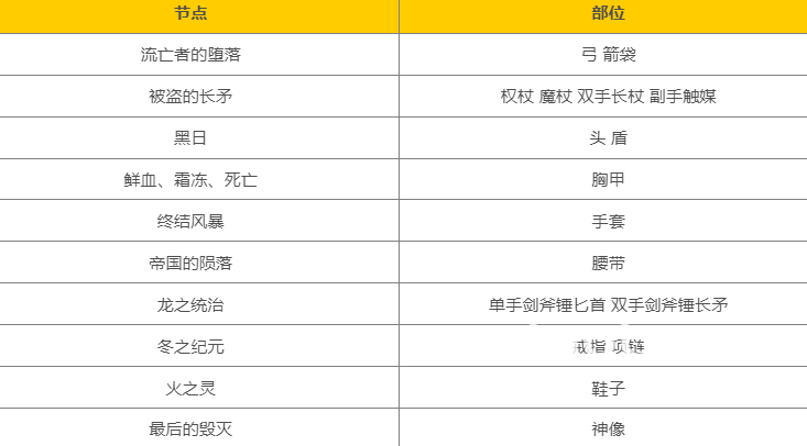 那么我们该去哪里找它们呢?新手玩家们去的最多的地方就是时空盛殿和无光之亨,这里可以稳定出一些品质较高的装备或者材料,如果这两个地方不能满足你的需求了,那就去时空秘境的节点吧!不过这里不同节点掉落的东西也是不同的,详情如下图所示。