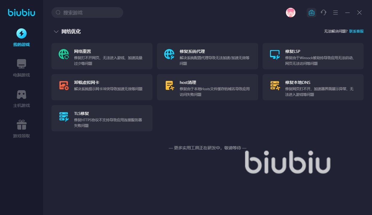 如果是因为网络问题引起的闪退,还可以利用biubiu软件中自带“百宝箱”中的网络修复工具来解决,每个都可以尝试下,可以解决很多常见问题。这个工具箱的功能还在不断扩充中呢!相信后续会有更多实用的功能加入其中。