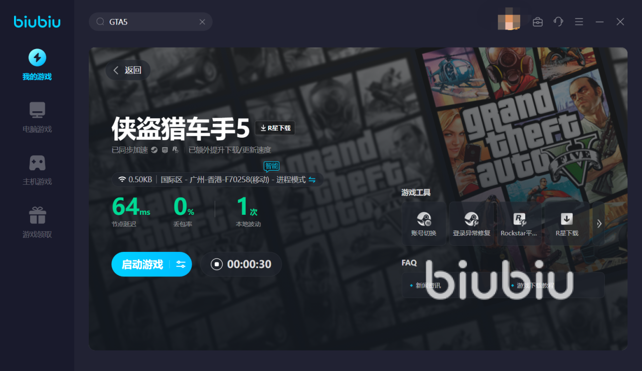 gta5游戏的开始主要就是让大家来积攒钱币了,你需要与其他的惯犯和同类去找到躲避的房子,这样大家在完成后期的直升机任务和抢夺任务的时候才能更加快速且安全一些,最好还要带个车位,探索洛圣都地方的所有角落,不同的任务当中要去切换不同的英雄角色,不同的故事情节为你带来的不同感受和体验,驾驶各种当车辆在这里进行自由的探索。在游戏刚开始的时候其实有没有加速器影响都不大,你要开启主线任务的时候就应该配有biubiu加速器了,这样能有效的减少卡顿、闪退和无法登陆等现象,所以大家可以通过点击按钮尝试使用biubiu加速器。