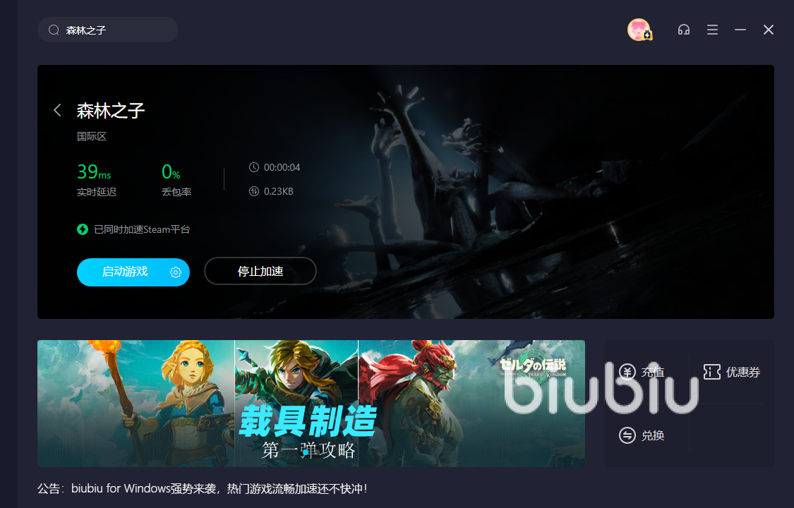 2024年03月14日 14:24 来源:魔法悦火爆猴玩森林之子游戏的小伙伴都知道一个人玩久了多少有点无聊孤单,如果能跟自己的好友一起玩的话,会收获很多的快乐,但是近来有不少的玩家游戏的时候总会遇到各类网络问题,那么森林之子游戏崩溃因为什么呢?大家最怕的就是游戏的时候突然遇到的网络问题,会让玩家一时间乱了阵脚,重新退档再一次进入就很是麻烦,所以小编想给大家分享biubiu的这款加速器。