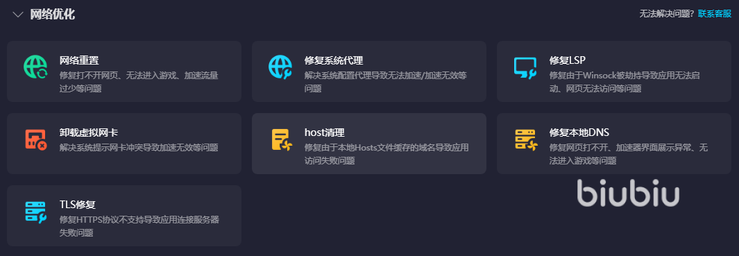 海外的很多新游戏在进入之前还要进行一个全面的清理,因为海外游戏的一些文件可能会与你电脑的内置文件产生冲突,就比如虚拟显卡可能就没法完全适配这些游戏,要是想不费时间去解决的话,可找到biubiu的工具箱里针对自己需要的功能来进行处理,处理的时间也是一秒钟。
