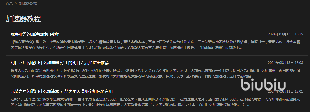 biubiu还有其他的功能,刚接触软件的小伙伴可以先从官方里的教程开始学起。这些教程都是靠谱的经验之谈,教大家如何应对不同的加速故障,并且针对每款游戏都推出专门的教程指引。大家只要跟着教程学很快就能掌握技巧,从此玩转biubiu。