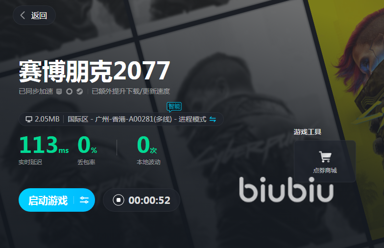 环境改善以后,大家随时都可以点击按钮来加速游戏了,它的加速是随时可以开启并且停止的,页面上直接显示加速后的网速情况,还能看到已经加速的时长以及其他辅助小工具。软件带来电竞级的网速,大家在这样的条件下进入赛博朋克2077玩起来就特别爽了,一秒就能领取到任务,移动速度也很快,遇到敌人就能反应迅速地进行反抗或者攻击,再也不用受到延迟的干扰了。