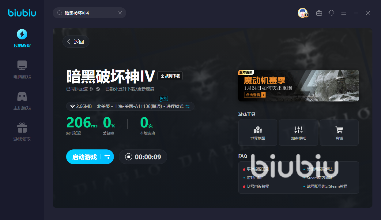 由于暗黑4如今仍旧没有国服,所以为了打通其他区域的暗黑世界。就得使用biubiu,这样才能流畅加速,并踏入这片暗黑世界,让你有直面魔神的勇气!此外新用户可获得24H的免费加速,接着新旧用户都能凭借【biubiu不卡顿】,领取一次三天免费加速。然后游戏内除了魔物之外,还会出现其他玩家,为了战胜它们。同样要在biubiu的帮助下,方可助你挥斥方遒,流畅地使用出组合技能,才能快速地打败每个敌人!