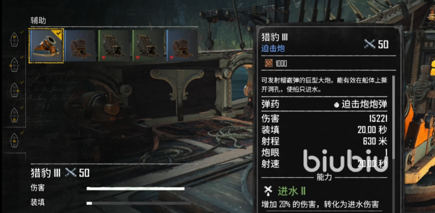 这个算是辅助炮,不过威力巨大,装填速度非常慢,但是可以用来打大量输出。比如猎豹系列就是装在甲板上,体型巨大可以发射榴霰弹,并且在50米内爆破,还可以得到15的伤害加成。另外对于进水的船只也有20%的增伤效果,算是一个强有力猛攻武器。唯一的缺点就是比较难命中,非常考验玩家对于准确度的把控。