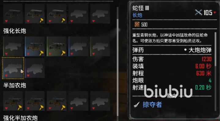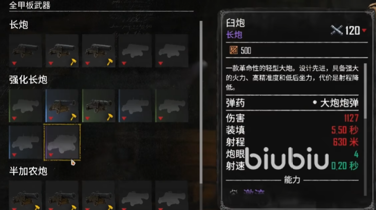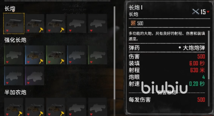 多功能大炮,所有属性都适中,不管是射程还是伤害,包括装填速度都达到了及格线,型号总共有5个。长炮1是最基础的,500材料就可以兑换,射程630。伤害达到了500点。后期可以逐渐升级更换成更高等级的长炮,效果会有提升。
