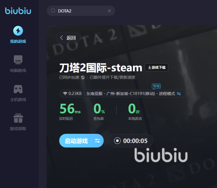 在biubiu上搜索游戏基本是不会受到任何限制的,各大经典热门的游戏应有尽有,就连游戏玩家喜欢的小众冷门的游戏都能找到,也是极度受欢迎的一大特色。同时推出了的限免游戏,从下方图片就可以看到搜索DOTA2弹出的加速界面,大家可以按照自己当前玩的游戏选择启动加速。