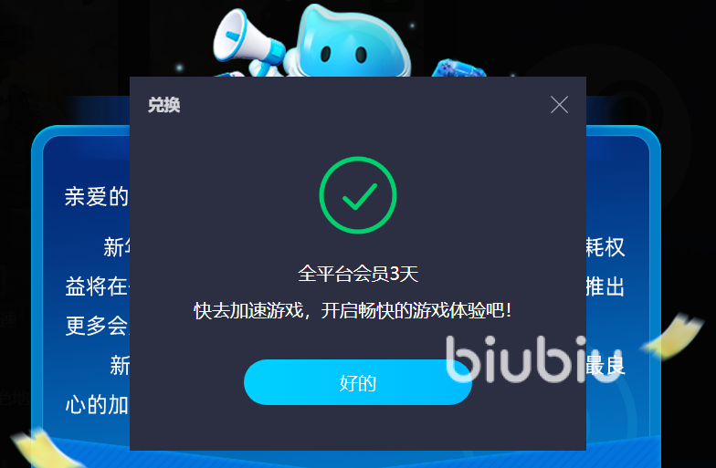 虽然biubiu加速器的体量较小,但从下载到安装所花费的时间却很少,但这也并不影响它性能的强大,在大家注册成功之后新人能领取24小时免费时长。还有就是平台推出的所有用户都能参加的兑换码活动,要将【biubiu不卡顿】这个兑换码输入到对应的窗口来兑换,生效就能领取三天免费时长,这个兑换码活动的数量有限,先下载,先输入,先得到。