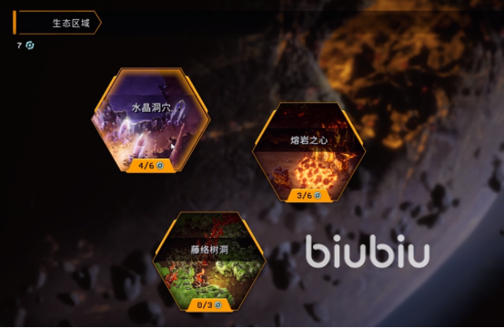 游戏目前有三张生态区域,分别是熔岩之心、水晶洞穴和藤络树洞。每个地图下面会有小齿轮,我们需要完成地图上的一些任务从而解锁其他地图环境和游戏难度。比如风险等级1的地图需要完成一次深潜,将深潜GK2突击步枪升级到12级,以及收集200单位黄金。