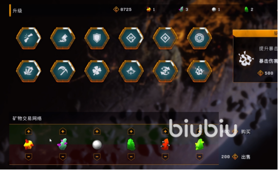 和其他的肉鸽游戏一样,我们可以通过完成任务时获得的资源来给角色升级,这些升级是永久加成的。目前有12个升级项目,每个升级项目可以升级12次,建议前期主要升级移动速度和挖矿速度。其次是获取经验和拾取范围,再次是伤害和幸运,其他的属性有矿石提升即可。