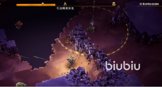 游戏上方会显示最新任务,我们需要完成对应的任务指示。比如找寻补给信标,我们根据左上角的地图找到黄色图标,朝着对应的方向前进。来到这里地上会出现一个黄色的圈,我们需要清空其范围内的所有障碍物,清空后金黄色的圈会变成淡蓝色,之后站在圈内一定时间补给就会掉下来。需要注意一点不要立刻就把补给召唤下来,因为在落到地面时,补给会爆发很大的伤害,我们可以让怪物聚集后在进行召唤。