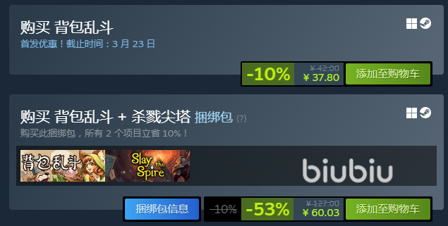 最近刚出的游戏,需要玩家利用自己的背包在里面装上合适的道具,当它们在一起生效之后就可以拿去跟对手战斗了。目前打完折之后是史低价格,只要37.8元。