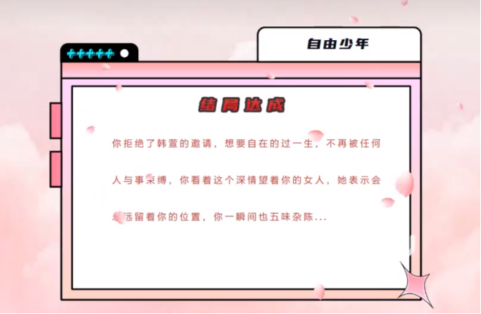 好了,关于自豪美女全攻略自由少年的内容就介绍到这了。小伙伴们要想达成自由少年结局,一定不要选择会提升她好感度的选项,如果听到了一阵音效的话,那就是选了增加好感的答案。当然如果不小心选择了,可以读档重新开始选择。