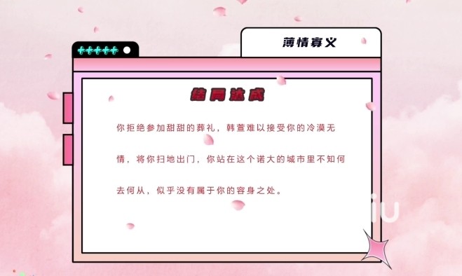 当然若是我们选择留下来,而主角也正式加入了韩萱的公司成为了股东,韩萱也邀请男主回来公司做游戏,但是这时候传来甜甜死亡的消息,主角拒绝参加葬礼。韩萱觉得男主太冷漠了,将他扫地出门。