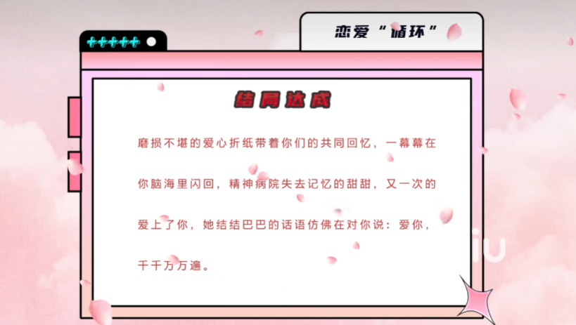 4、恋爱循环:获得的资金用来治愈甜甜的病,这个病情虽然可以治愈,但是容易反复,甜甜也时好时坏。最终在精神病院的甜甜已经失去了记忆,但还是会不停地折叠爱心折纸,表达对主角的爱。