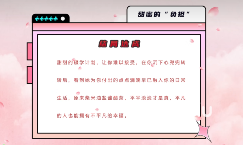 1、甜蜜的负担:选择救甜甜之后只收到甜甜的留言,在主角的帮助下终于有资金治好了甜甜的病。她最终选择了辍学,主角心里虽然难以接受,但是两人的生活已经融为一体了,感觉到平平淡淡的幸福。