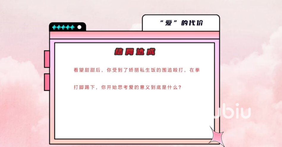 2、爱的代价:这里是友好度不够出现的结局,过程根本上一个差不多,但是在看完即将病逝的吴甜甜之后,这件事让娇丽的死忠粉丝知道了,对玩家进行了拳打脚踢。