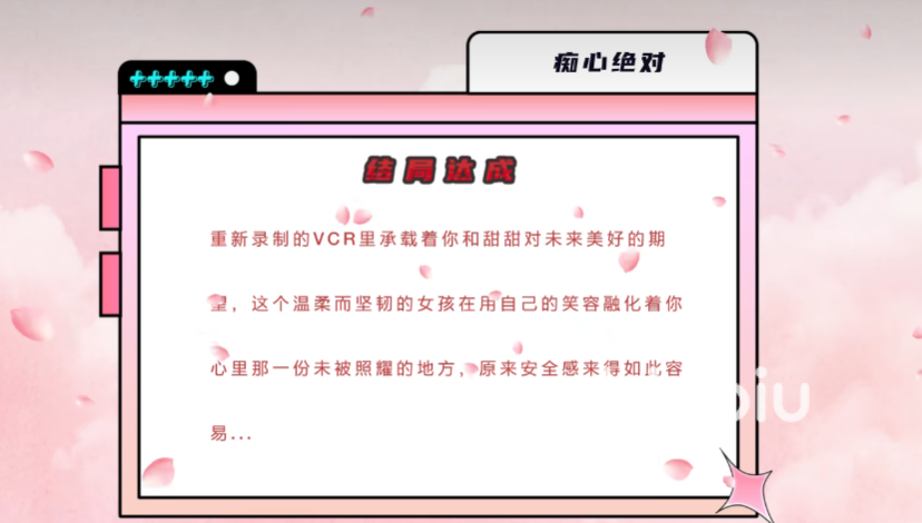 3、痴心绝对:病重的甜甜录制了一段告别VCR,主角从父亲那得到的资金成功的救活了她,对话当中要选择鼓励她,给了她积极向上的希望,甜甜病好后也重新录了一段对未来展望的VCR。