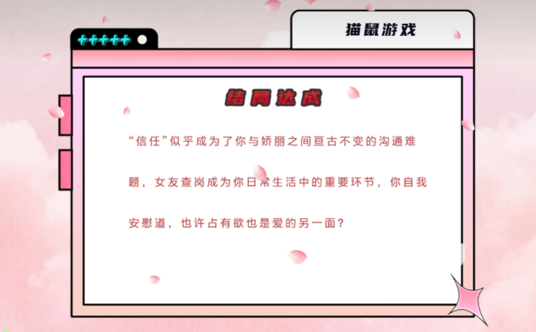 1、猫鼠游戏:前期友好度足够,得到钱之后选择帮助杨娇丽摆平经纪人的事情,成功解约并且两个人在一起之后,主角会发现杨娇丽删了自己的微信好友信息,选择质问她。此时杨娇丽就会缺乏对主角的信任感, 后面恋爱过程中总是会查岗,也是恋爱的烦恼。