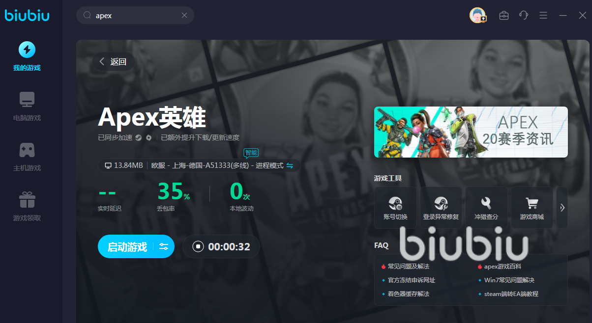 那么现在大家都知道apex英雄直接卡屏动不了怎么解决了吧,打开biubiu以后启动一键加速,玩游戏的时候就不会卡卡的一直动不了了。有了biubiu大家就可以在apex英雄里畅通无阻,选择自己喜欢的模式痛快玩起来吧。