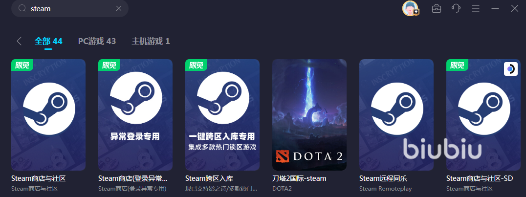 biubiu的加速功能十分强大,支持的游戏也多。大家不管是想要加速steam平台还是加速steam游戏都可以,软件收录了非常多的游戏,只要是能够搜索到的平台和游戏都支持一键加速。