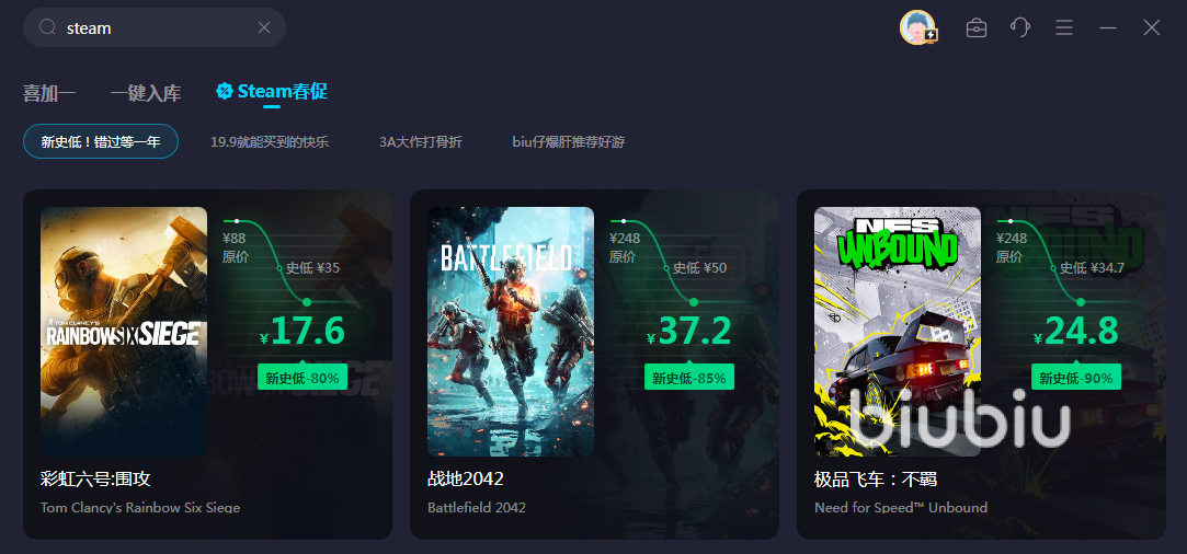 steam游戏虽然好玩,但是大部分游戏都是比较昂贵的,大家省吃俭用好不容易才能买一个新游戏。现在biubiu为大家准备了steam春季促销,参加春促的都是好玩又实惠的游戏,价格比平时低很多,现在下手是非常划算的,小伙伴可以逛一逛宣传页面,看到喜欢的游戏赶紧下手。