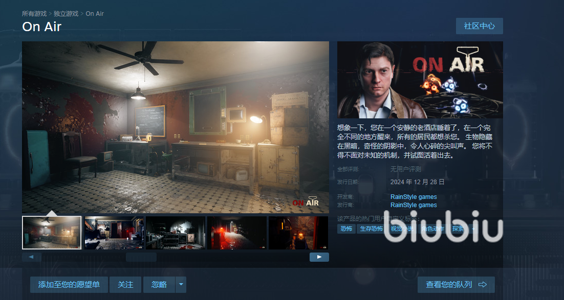 广播作为一款第一人称类型的恐怖游戏,英文名叫做on air。玩家们需要将一座老宾馆的每个房间、甚至每个角落都探索一遍。但是这座宾馆有着各种离奇的地方,并且充满了恐怖元素以及氛围,所以为了完成这个任务,还需要考验大家的意志力。需要一边战胜各种恐怖元素,然后还要破解里面的各种谜题及元素,还有击败里边的生物。然后该游戏在steam里上架,因为在这可吸引更多的游戏用户,毕竟它的体量非常大,知名度也高。只不过开启游戏前都需要在steam上启动,然后才能享受上面的各种功能,例如及时存档。