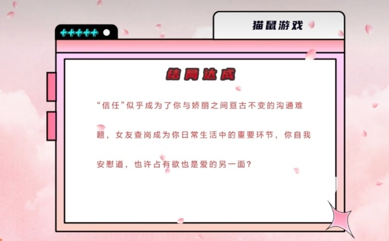 这个结局就这样达成了,两个人虽然在一起了,但是比较缺乏信任,杨娇丽会经常查岗主角。这样的占有欲让主角感觉有些不适,可因为爱情也只能自我安慰是爱的一种表现。自豪美女全攻略猫鼠游戏剧情就介绍到这里了,重点就是选择质问,将不信任感加剧了,想玩其他结局可以换换回答哦。