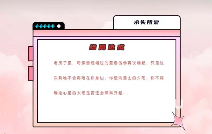 之后画面就会来到我们结婚前,鞠唯问我们以后在一起是否会幸福,我们要想达成永失所爱成就的话,就一定要选择第二个选项不确定。在全程的对话中,小唯的心和满满的爱意一直被打击、消磨,但是我们却毫无发现。