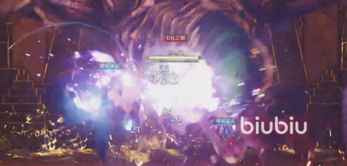 一开始怪物并不会释放太多技能,玩家一个劲输出,打出来它的僵直状态,一会子就可以打掉怪物一格血了。这时候怪物就会抬爪子释放它的石化之眼,头顶上有一个绿色的小光珠往地下放射线,很好躲开。
