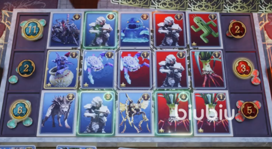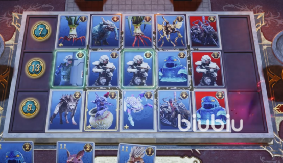 面对铁壁姬芙莉我们的卡组和挑战腹语师的基本一样,只是将生化鼠换成了仙人掌怪,然后进入对局。我们先将卡姆之牙放在第三行第一个格子里,接着将警备兵放在它前面,随后将响板蟹放在第二行第二格,再放女王蜂到第三行第三格。如果我们的卡牌上来的不是很好也不要着急,想办法先占阵地,随后尽可能在对方得分少的行添加棋子,舍弃己方得分少的行。不要一味地跟随敌人的棋子行动,要尽可能保证自己三行分数比对手得高。