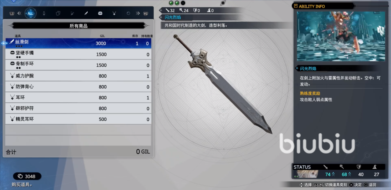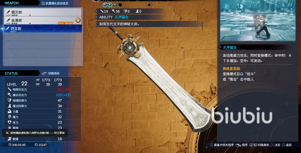 可以在主街道主要街区找到,在克劳德完成和士兵的对话后,我们往右侧走即可。符文剑刻有古代文字的神秘大剑,能力是无序猛击,发动高威力攻击,同时变化模式。命中时ATB会增加,空中亦可触发。熟练度奖励:变换模式后以“战斗”或“强击”击中敌人。